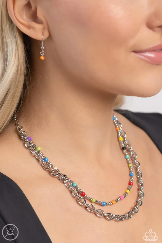 Layered beside a bold silver chain, dainty silver and multicolored beads are threaded along an invisible wire below the collar, resulting in a colorfully layered design. Features an adjustable clasp closure.