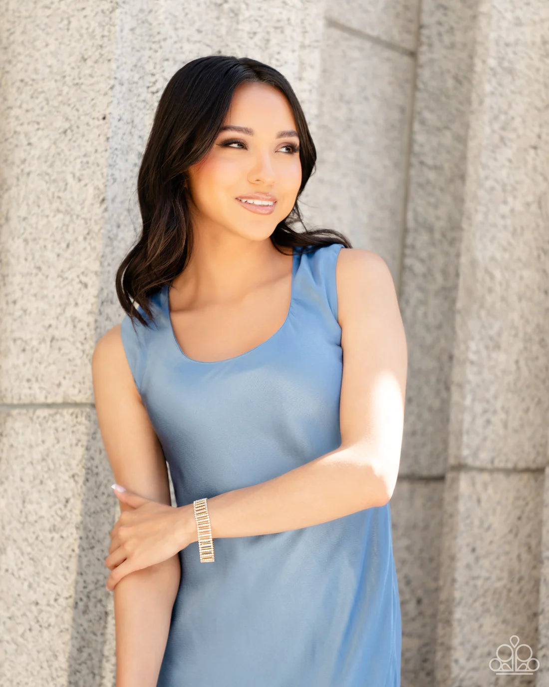 Separated by white rhinestones, rhinestone-covered gold bars and thin sleek gold bars alternate around the wrist for a glitzy display. Features an adjustable clasp closure.