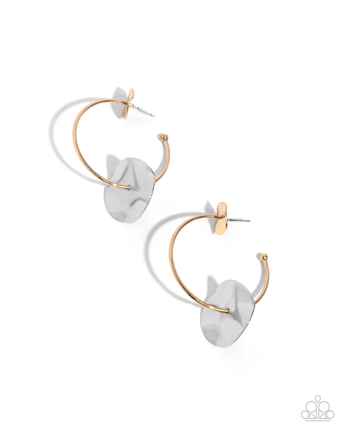 Featuring a hammered finish, a wavy abstract silver disc is infused along the uppermost curve of a classic gold hoop. A matching wavy, hammered silver disc, but in a much larger scope glistens from the center of the hoop for a timelessly textured display. Dainty gold balls are affixed to the ends of the hoop, reminiscent of a barbell fitting for a sleek finish. Earring attaches to a standard post fitting. Hoop measures approximately 2" in diameter.